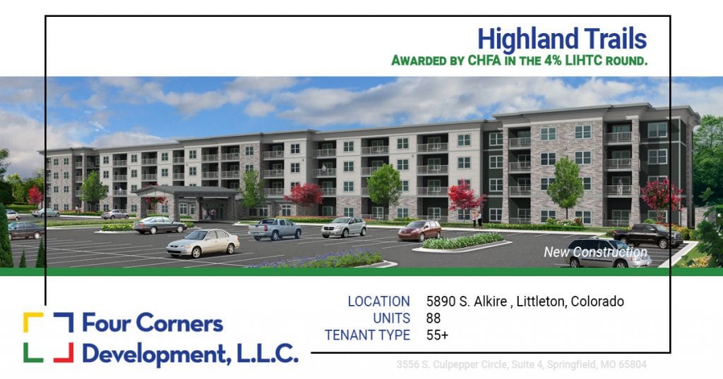 On November 9th Four Corners Development, LLC was awarded Highland Trails, a development in Littleton, by CHFA in the 4% LIHTC round. This award consists of allocation of both State and Federal tax credits. Highland Trails will be a new construction project for Seniors. Highland Trails will represent the first affordable senior housing development to be built in west Littleton, unincorporated Jefferson County, serving the 55+ population. As a suburb of Denver, Littleton is part of the Denver-Aurora metropolitan area and the Front Range Urban Corridor.